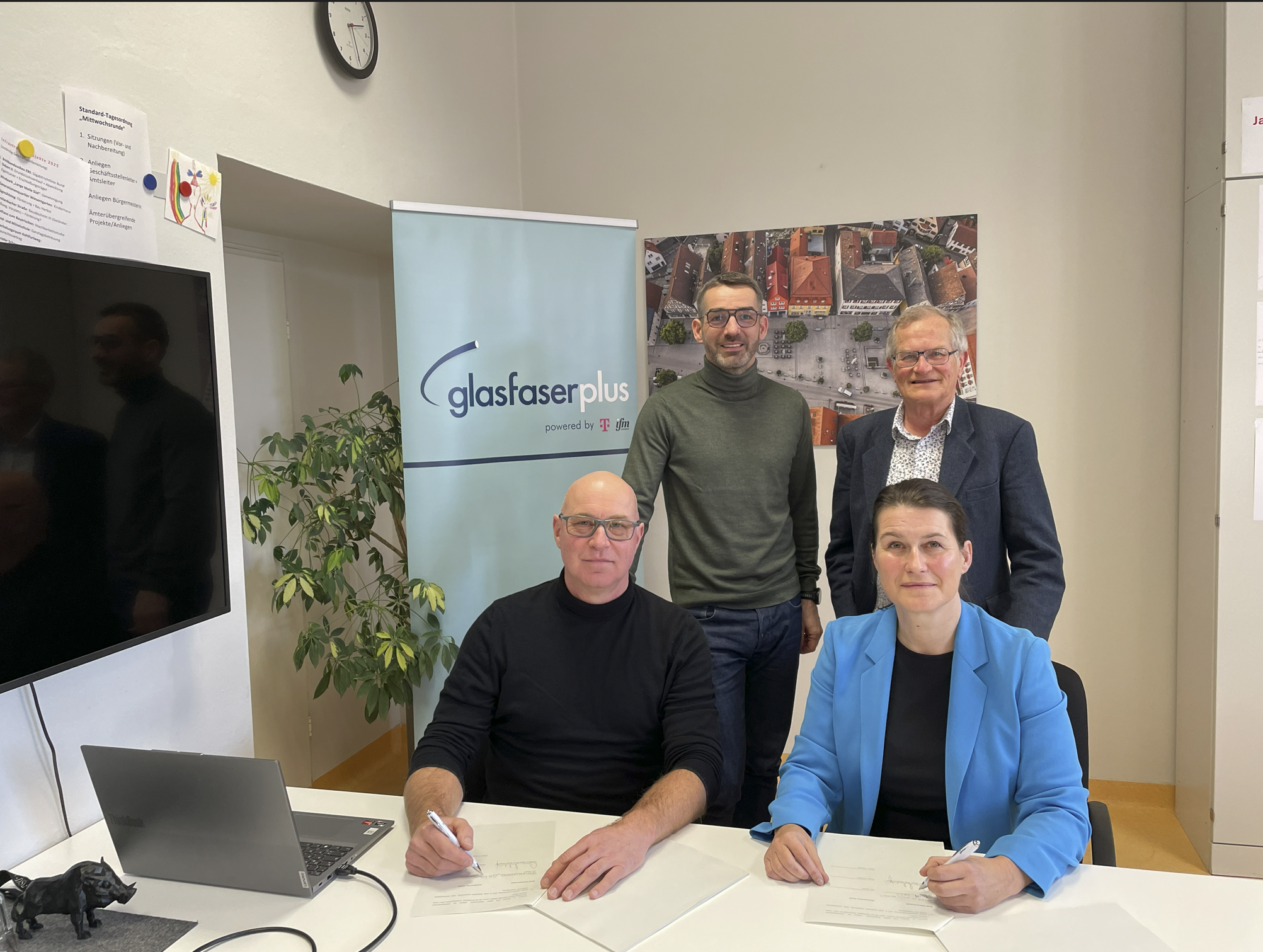 Von links: Dominik Weyrauch (GlasfaserPlus), Oliver Knöll (Telekom-Regionalmanager), Chara Karagianni (Projektleiterin Artemis), Benjamin Göbel (Bürgermeister) sowie Elke Högy (Bauamstsleiterin) Copyright: Dominik Weyrauch (GlasfaserPlus) Ab sofort...