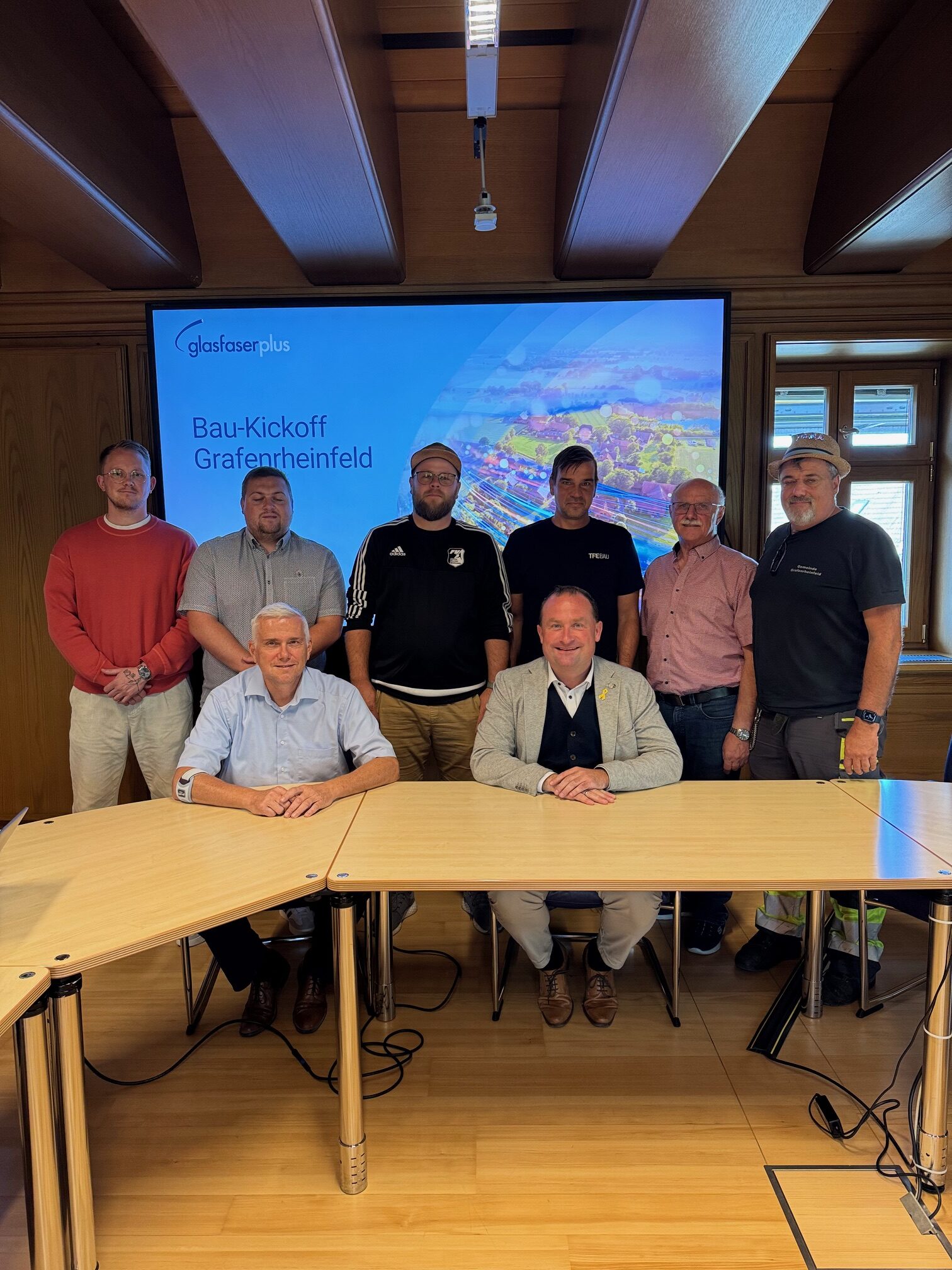 Von links hintere Reihe: Maximilian Riks (Externe Baubegleitung STF Tele Consult GmbH), Leon Ramerth (Projektleiter Telekom Technik), Mathias Riener (Baubegleitung Dr. Först Consult), Markus Fabig (Geschäftsführung TFE Bau GmbH), Gerhard Riegler (Zweiter Bürgermeister Gemeinde Grafenrheinfeld), Matthias Pfister (Bauhofleiter Gemeinde Grafenrheinfeld) Von links sitzend: Thomas Weigand (Kommunalberater Glasfaser), Christian Keller (Erster Bürgermeister Gemeinde Grafenrheinfeld)