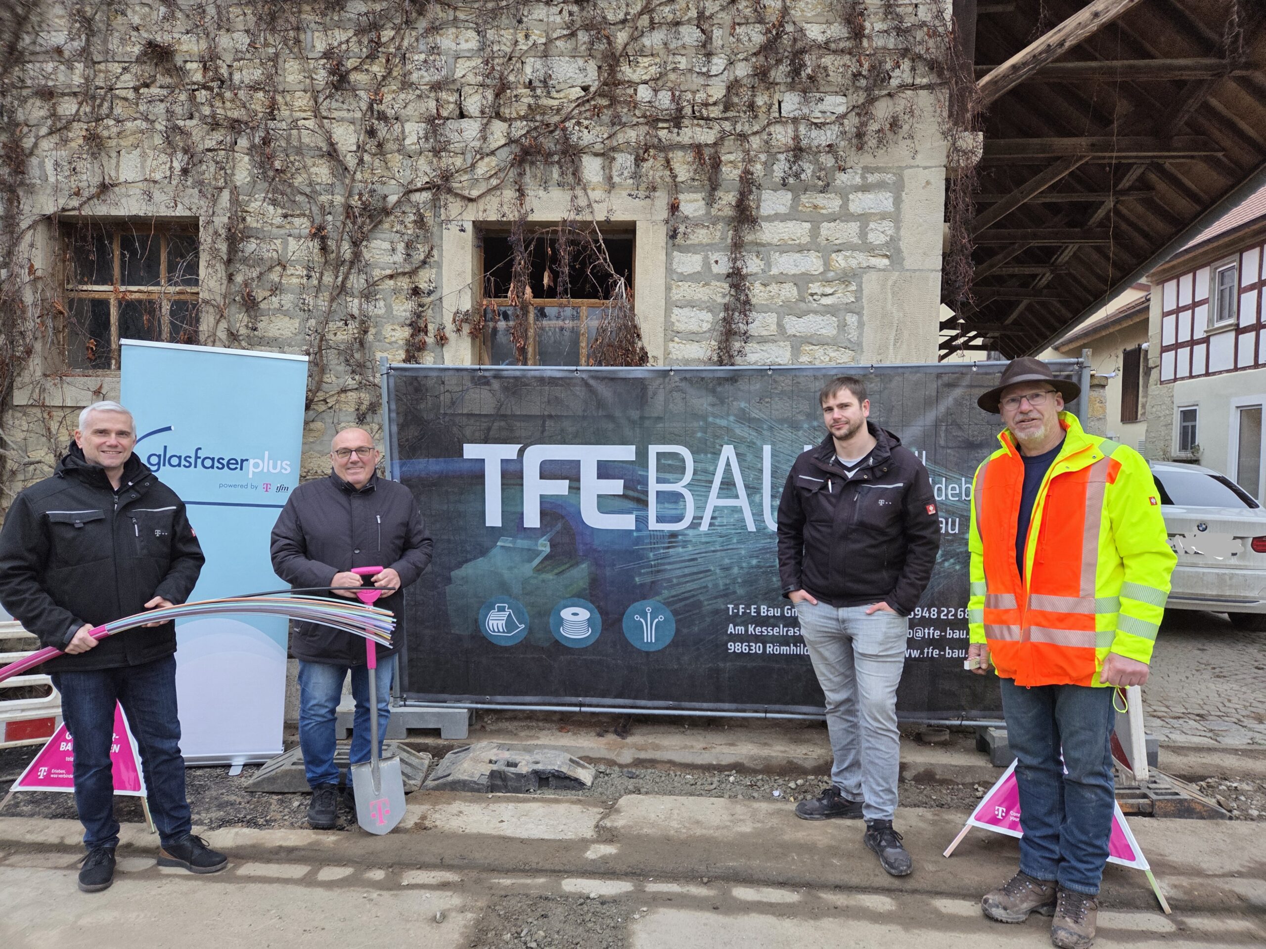 Von links: Thomas Weigand (Kommunalberater Glasfaser), Rainer Ott (1.Bürgermeister von Martinsheim), Thomas Haas (Bauleitung Telekom Technik), Uwe Becker (Bauleitung TFEBau)