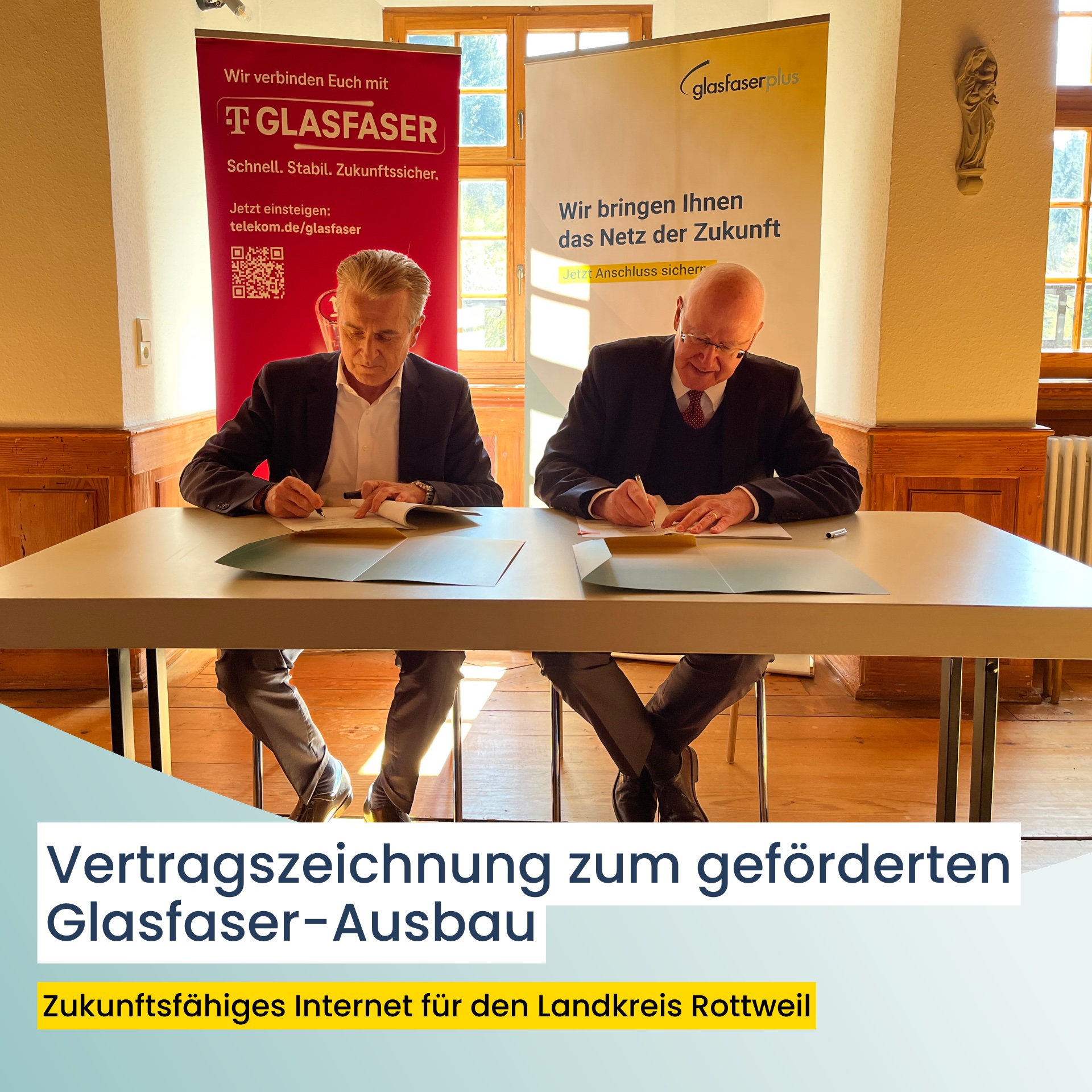 Die GlasfaserPlus hat die öffentliche Ausschreibung für den geförderten Glasfaser-Ausbau im Landkreis Rottweil gewonnen. Nach der Fertigstellung können rund 5.200 Adressen in 13 Kommunen Anschlüsse mit einem Tempo von bis zu 1 Gbit/s (Gigabit pro Sekunde) nutzen. An der Ausschreibung hatten sich mehrere Netzbetreiber beteiligt, das wirtschaftlichste Angebot wurde dabei von der GlasfaserPlus abgegeben. Der Landkreis und GlasfaserPlus haben zur Realisierung des Projekts jetzt einen Vertrag unterschrieben.