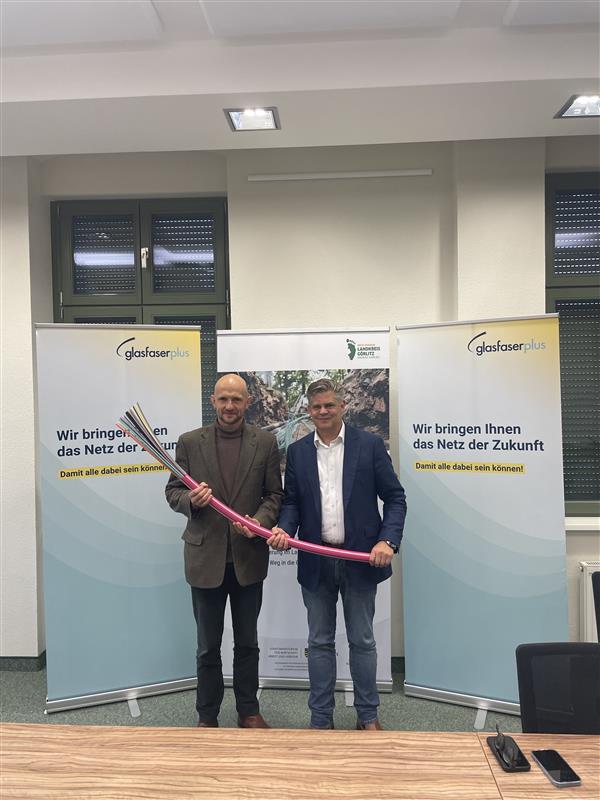 Von links: Dr. Stephan Meyer (Landrat des Landkreises Görlitz), Jens Olaf Berwig (Chief Commercial Officer GlasfaserPlus)