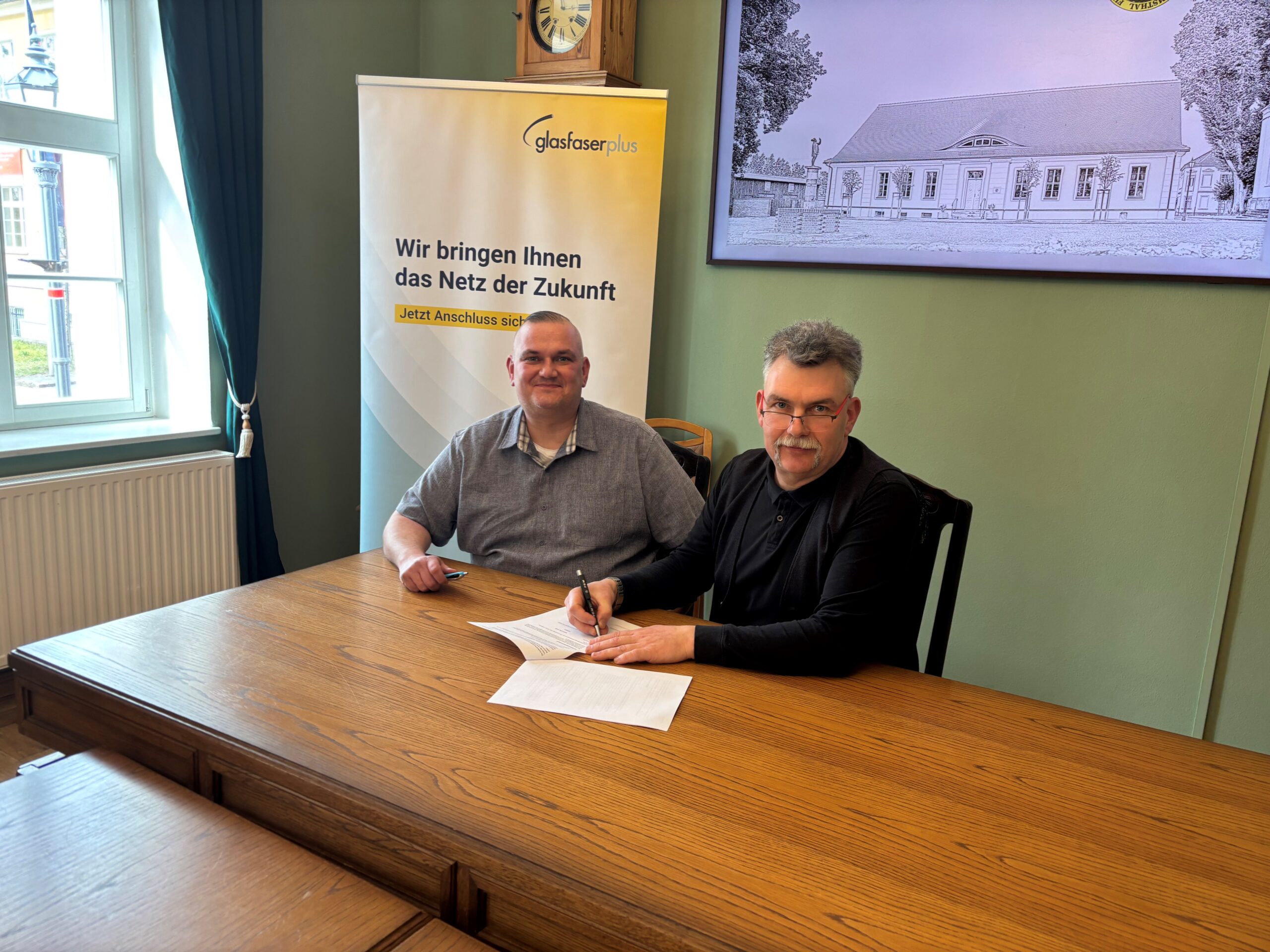 GlasfaserPlus wird 2026 in Joachimsthal Glasfaser-Anschlüsse bis ins Haus bauen. Die Stadt und GlasfaserPlus haben dazu am 02. April 2026 eine gemeinsame Erklärung unterzeichnet. In diesem Zuge werden rund 1.360 Haushalte und Unternehmensstandorte im Stadtgebiet angeschlossen.