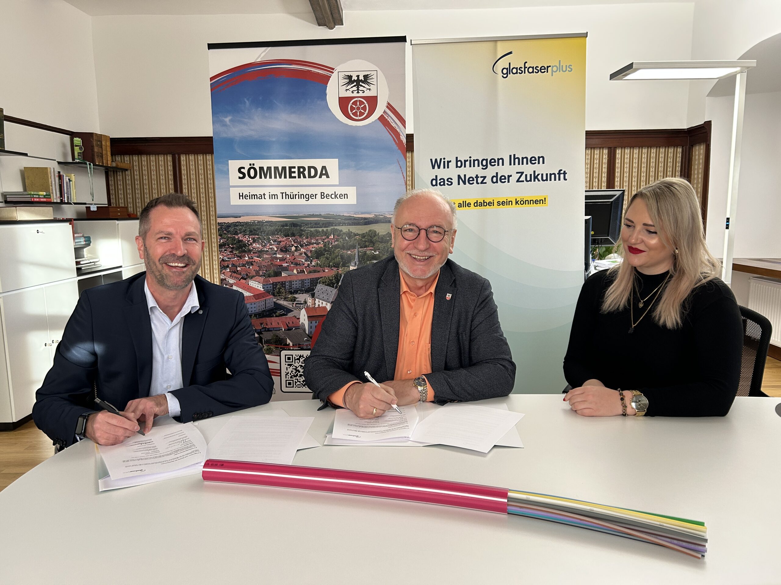 GlasfaserPlus wird 2026 in Sömmerda Glasfaser-Anschlüsse bis ins Haus bauen. Die Stadt und GlasfaserPlus haben dazu bereits am 08. Dezember 2025 eine gemeinsame Erklärung unterzeichnet. In diesem Rahmen werden rund 9.040 Haushalte im Stadtgebiet angeschlossen.